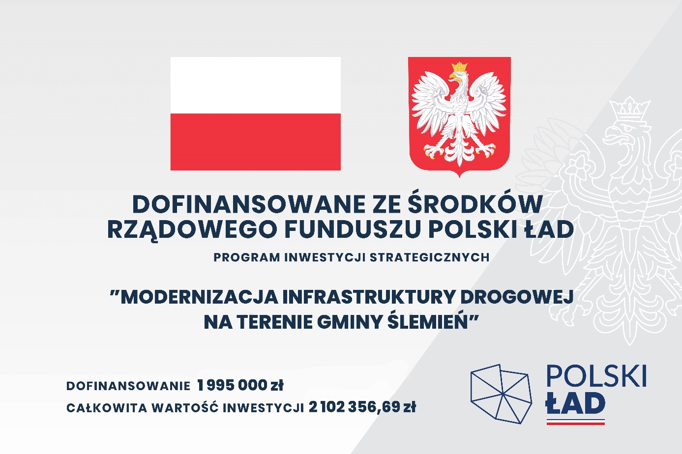 ZADANIE DOFINANSOWANO ZE ŚRODKÓW PROGRAMU RZĄDOWEGO FUNDUSZ POLSKI ŁAD PROGRAM INWESTYCJI STRATEGICZNYCH W KWOCIE 1 995 000 zł co stanowi 94,89 % wartości inwestycji oraz DOFINANSOWANO Z RZĄDOWEGO FUNDUSZU INWESTYCJI LOKALNYCH W KWOCIE 107 356,69 zł co stanowi 11,43 % wartości inwestycji.